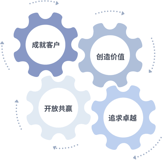 成就客户是一切决策的出发点,,,创造价值是衡量所有工作的标准,,,追求卓越是我们做事做人的态度,,,,开放共赢是我们的格局也是最终的结果。。。。价值观的齿轮环环相扣,,,,推动着组织里的每个人不断向前。。。。