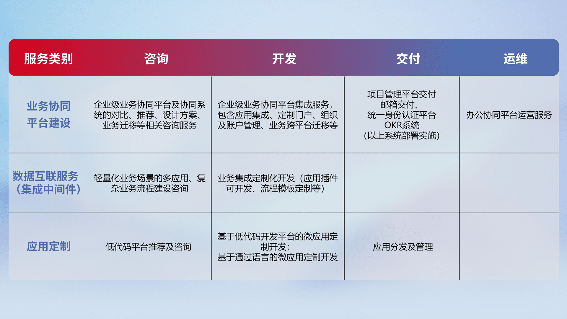 针对钉钉、、企微、、、IDaas等平台级产品提供产品的规划、、、方案、、、交付、、定制化开发等服务,,,,实现如统一协同办公、、、智能客户服务、、、、混合会议管理、、、智能数据查询、、等业务场景,,实现数字化转型。。。。